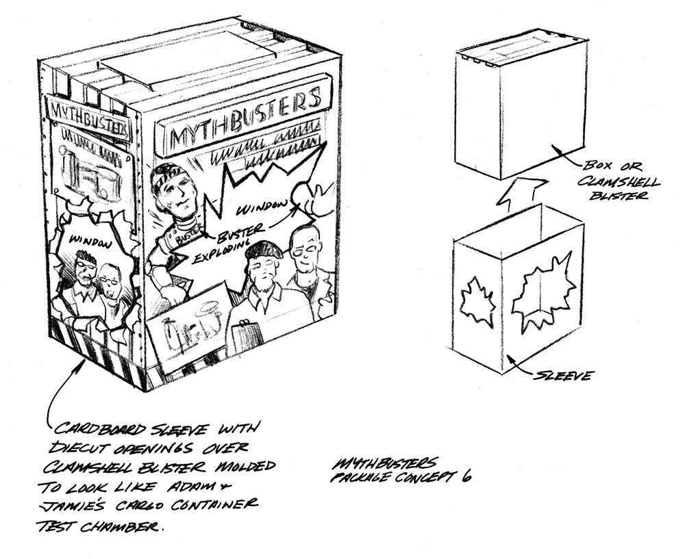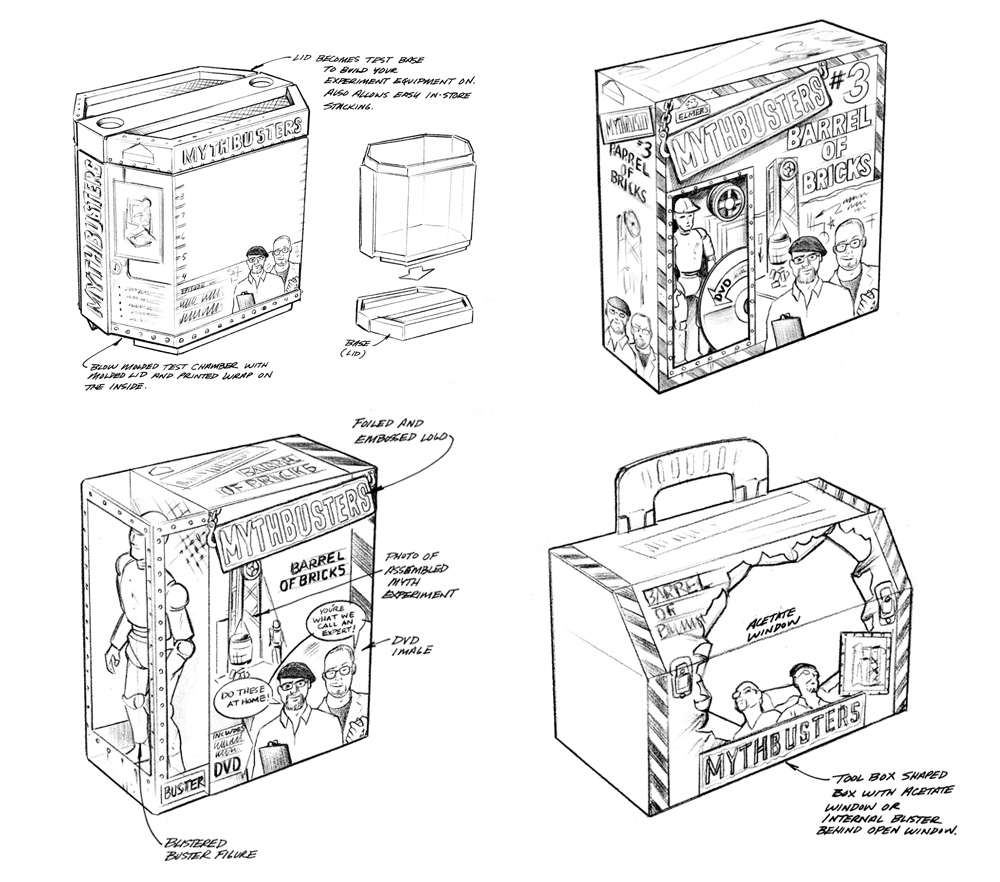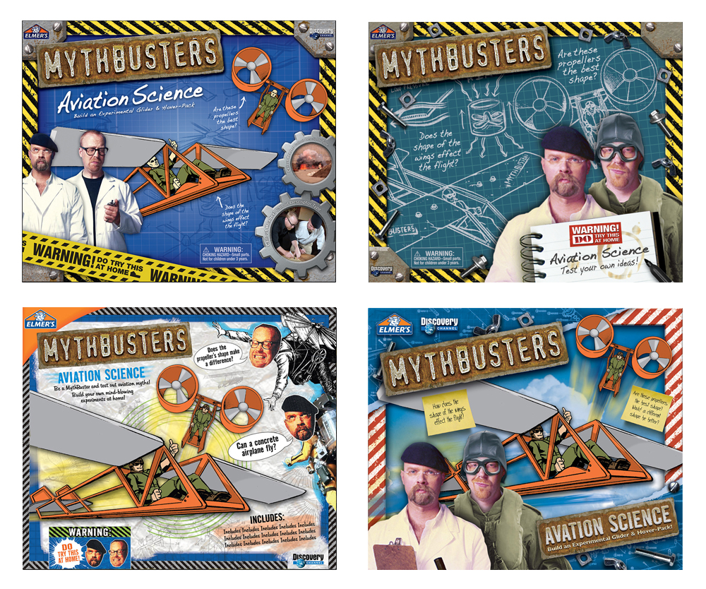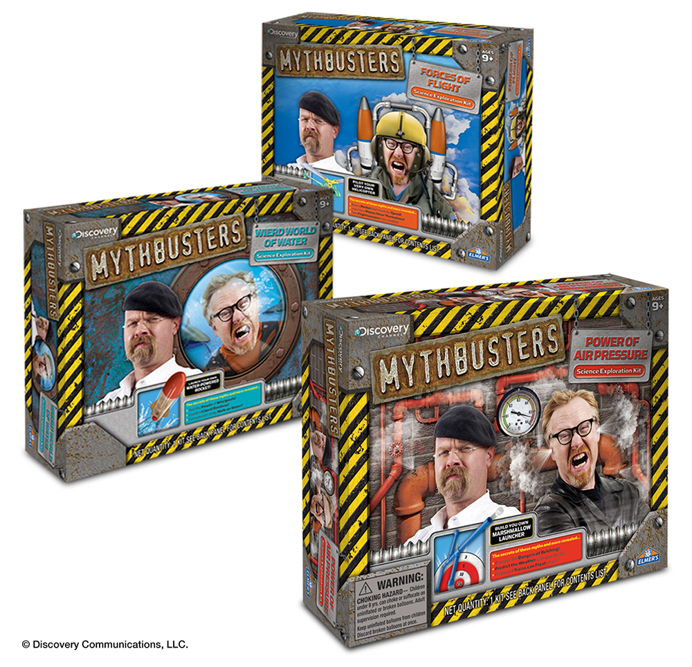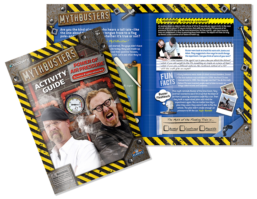 Scrambled Eggz was engaged to develop and design Elmer’s Mythbusters Science kits. With little assets to work with other than a logo and one photo, we established a brand look that was so well received that it became the basis for all Mythbusters branded products moving forward. Please scroll down to learn more about our design process.